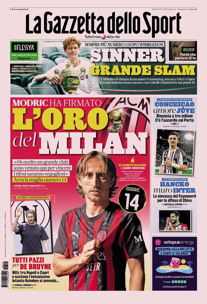 'La Gazzetta dello Sport' oggi in edicola, in prima pagina, apre con l'ufficialità di Luka Modrić come nuovo giocatore del Milan: ieri la firma sul contratto annuale con opzione sulla seconda stagione. Ha scelto la maglia numero 14 e, nelle sue prime parole, traspare tutta la voglia di vincere del quasi 40enne centrocampista croato.