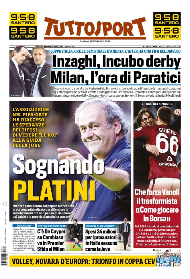 Infine, 'Tuttosport' oggi in edicola, in prima pagina, apre con l'assoluzione di Michel Platini dal 'FIFA-gate'. Ciò alimenta le speranze dei tifosi della Juventus di vedere 'Le Roi' alla guida del club bianconero. Lui ora non pensa di rientrare nel calcio, la proprietà non lo ha mai cercato, ma chissà cosa dirà il futuro.
