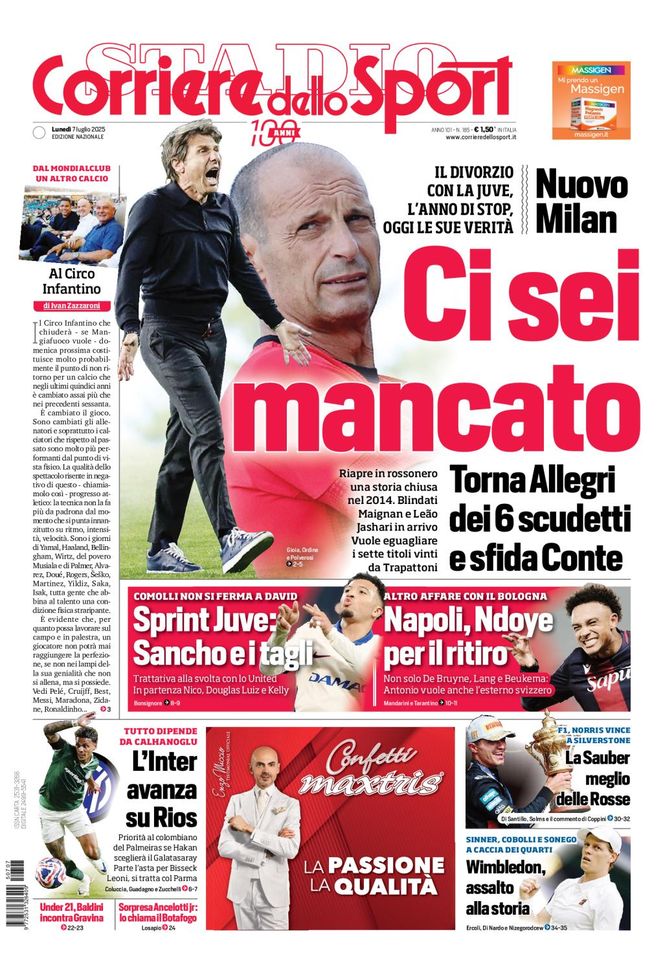 Il 'Corriere dello Sport' oggi in edicola, in prima pagina, saluta il ritorno di Massimiliano Allegri che, con il raduno odierno a Milanello, inizia ufficialmente la stagione 2025-2026 alla guida del Milan. Torna la sfida con Antonio Conte, riapre in rossonero una parentesi chiusa nel 2014 e in giornata parlerà in conferenza stampa a 'Casa Milan' per raccontare le sue verità.
