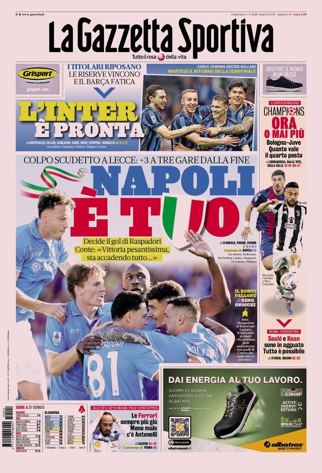 La Gazzetta dello Sport, la prima pagina di oggi, domenica 4 maggio 2025
