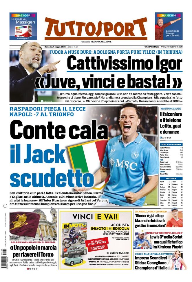 Infine, 'Tuttosport' oggi in edicola, in prima pagina, apre parlando di Lecce-Napoli 0-1, partita della 35^ giornata della Serie A 2024-2025 decisa da un calcio di punizione di Giacomo 'Jack' Raspadori. Alla squadra di Antonio Conte, ora, mancano 7 punti per portarsi a casa lo Scudetto.