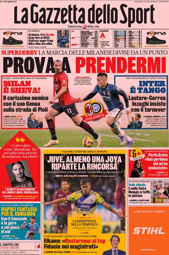 'La Gazzetta dello Sport' oggi in edicola, in prima pagina, apre parlando di Milan e Inter, oggi impegnate nelle partite delle 15^ giornata della Serie A 2021-2022. I rossoneri giocheranno in casa del Genoa dell'amico Andriy Shevchenko, con Zlatan Ibrahimović che guiderà ancora l'attacco. I nerazzurri, invece, ospiteranno a 'San Siro' lo Spezia dell'ex Thiago Motta. Le squadre di Milano sono divise da un punto in classifica. Si parla, poi, dei segreti del libro di Ibra, 'Adrenalina', da domani ufficialmente in vendita. Capitolo Juventus: mentre la squadra vince 2-0 in casa della Salernitana con Paulo Dybala ed Álvaro Morata, sul fronte societario John Elkann assicura collaborazione ai magistrati nell'inchiesta 'Prisma' della Procura di Torino. Il tutto mentre il Napoli, contro il Sassuolo, proverà ad allungare la propria fuga ...