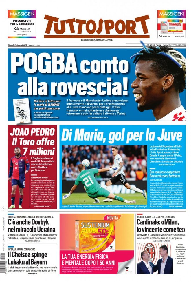 Infine, 'Tuttosport' oggi in edicola, in prima pagina, apre con il conto alla rovescia per il ritorno di Paul Pogba alla Juventus. Il centrocampista francese, classe 1993, salutato dal Manchester United. Ora è libero, a parametro zero, di poter firmare con i bianconeri. La Juve non molla neanche Ángel Di María, svincolatosi dal PSG, ieri protagonista assoluto di Italia-Argentina 0-3 a Wembley (che gol in pallonetto a Gianluigi Donnarumma!) e vicino alla squadra di Massimiliano Allegri. Si parla, quindi, anche del calciomercato del Torino: i granata, infatti, offrono 7 milioni di euro per acquistare João Pedro dal Cagliari, retrocesso in Serie B. Nel mirino del club di Urbano Cairo, poi, c'è sempre l'attaccante ucraino Artem Dovbyk, ieri sera in campo in Scozia-Ucraina 1-3 a Glasgow. Spazio, infine, al primo giorno di Gerry Cardinale come proprietario del Milan, all'intervista di Fabio Capello sui rossoneri e Paolo Maldini ed alle difficoltà dell'Inter di riprendere Romelu Lukaku. Il Chelsea, infatti, spinge il belga verso il Bayern Monaco.