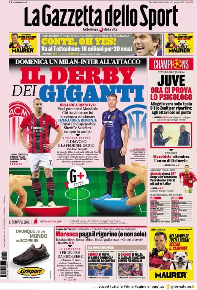 'La Gazzetta dello Sport' oggi in edicola, in prima pagina, apre iniziando a parlare del derby di Milano che ci sarà domenica sera e, più nello specifico, del confronto diretto tra Zlatan Ibrahimović, bomber del Milan, ed Edin Džeko, centravanti dell'Inter. Ibra punta il rinnovo di contratto perché vuole giocare i Mondiali 2022. In alto, sotto la testata, si parla del ritorno di Antonio Conte in Premier League: allenerà il Tottenham, contratto di 20 mesi da 18 milioni di euro netti. Mentre l'arbitro Fabio Maresca viene fermato per gli errori in Roma-Milan di campionato, stasera è di nuovo Champions League: la Juventus ospita lo Zenit, con il tecnico Massimiliano Allegri che prova a fare da psicologo per risolvere la crisi bianconera. L'Atalanta attende il Manchester United: per Gian Piero Gasperini nuovo incubo Cristiano Ronaldo.