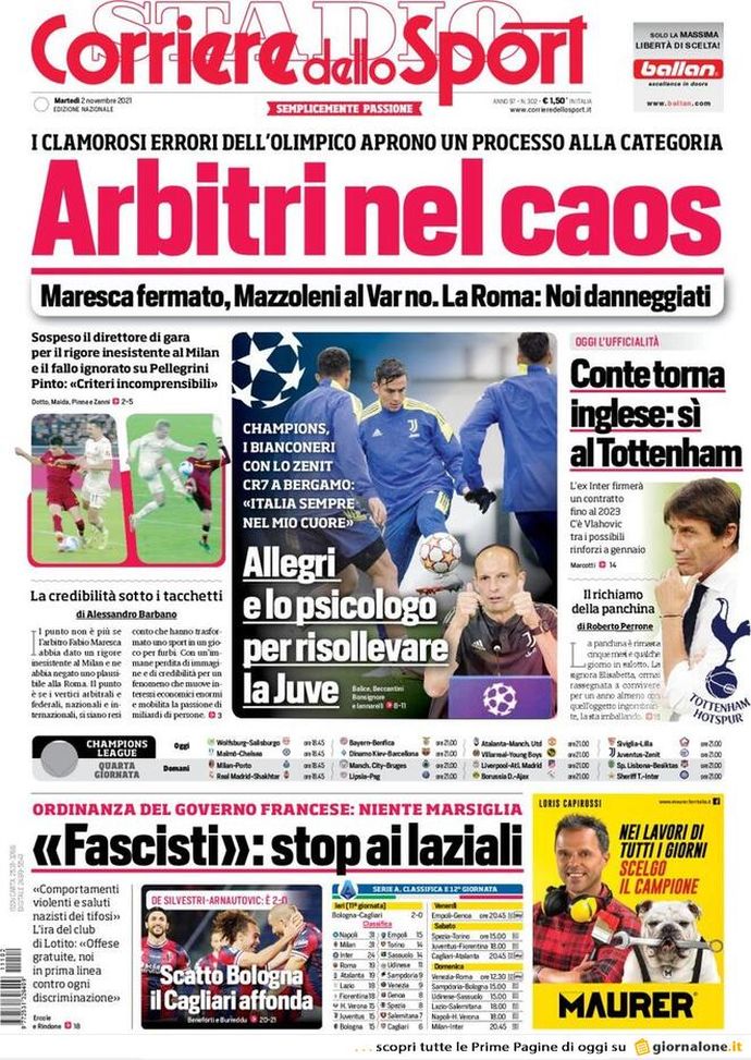 Il 'Corriere dello Sport' oggi in edicola, in prima pagina, parla del caos arbitri in Serie A. Fermato l'arbitro Fabio Maresca per gli errori in Roma-Milan, ma niente stop per Paolo Mazzoleni al V.A.R.. La Roma si sente danneggiata, ieri ha parlato anche il dirigente portoghese Tiago Pinto. Mentre grazie ai gol di Lorenzo De Silvestri e Marko Arnautovic il Bologna batte 2-0 il Cagliari nel 'Monday Night' dell'11^ giornata di campionato, oggi è già nuovamente tempo di Champions League: in programma Juventus-Zenit ed Atalanta-Manchester United. Il Tottenham riporta in Premier League l'italiano Antonio Conte, mentre è vietata la trasferta di Europa League a Marsiglia per i tifosi della Lazio. Il motivo? Sono 'fascisti'.