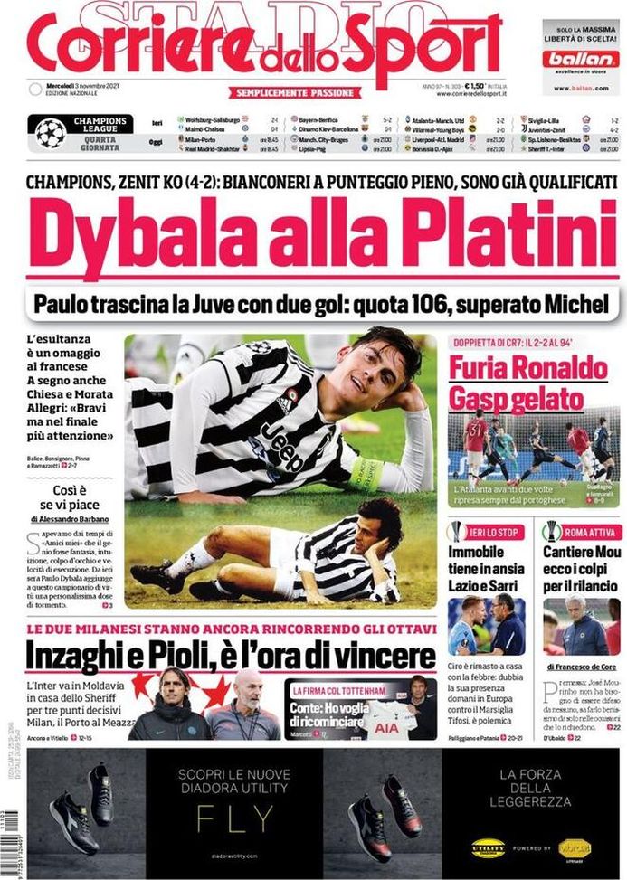Il 'Corriere dello Sport' oggi in edicola, in prima pagina, apre parlando di Paulo Dybala, autore di una doppietta in Juventus-Zenit 4-2 di Champions League. Raggiunto Michel Platini tra i cannonieri juventini di sempre, la 'Joya' gli ha dedicato l'esultanza della seconda rete. La furia di Cristiano Ronaldo si abbatte sull'Atalanta: doppietta del portoghese e 2-2 dei 'Red Devils' al 'Gewiss Stadium', con gol del pareggio al 91'. Quindi, la presentazione delle gare odierne, Sheriff-Inter e Milan-Porto, con nerazzurri e rossoneri condannati a vincere, e quella di Antonio Conte come nuovo manager del Tottenham. Domani in campo per Europa League e Conference League: Ciro Immobile ha la febbre, è in dubbio per Marsiglia-Lazio. La Roma è chiamata al riscatto all'Olimpico contro il Bodø/Glimt.