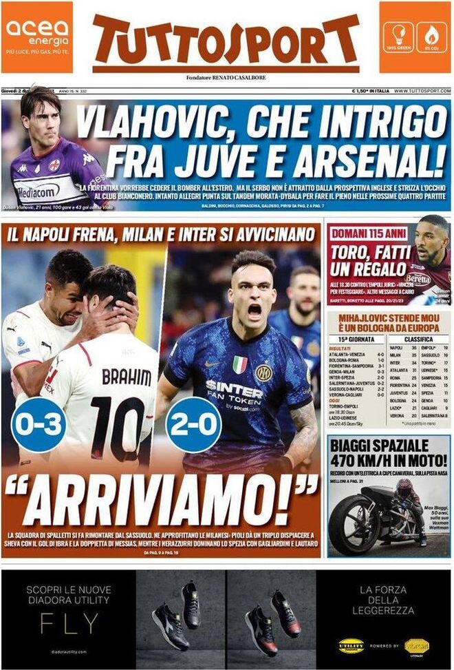 La prima pagina d 'Tuttosport', in edicola oggi, 02-12-2021