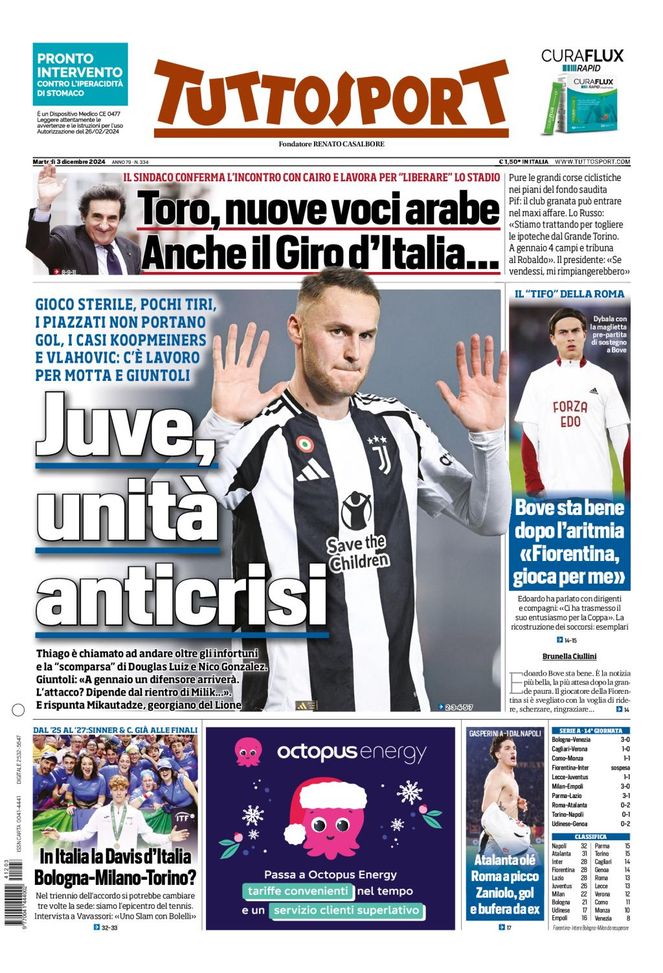 Infine, 'Tuttosport' oggi in edicola, in prima pagina, apre parlando della Juventus. E, in particolare, dell'unità anticrisi deputata a far risollevare le sorti della squadra bianconera in questa stagione. Da un lato, l'allenatore Thiago Motta, chiamato ad andare oltre i tanti infortuni ed a recuperare giocatori 'scomparsi' per vari motivi dalle rotazioni, come Douglas Luiz e Nico González.