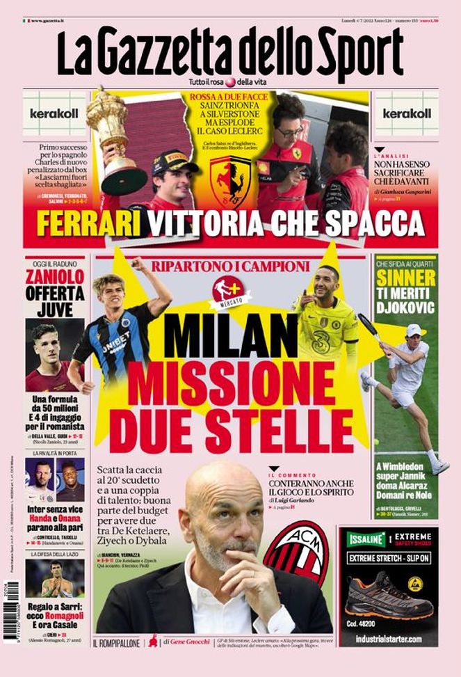 'La Gazzetta dello Sport' oggi in edicola, in prima pagina, apre con le mosse del Milan per questo estivo. I rossoneri, infatti, puntano a rinforzare la trequarti e vogliono investire buona parte del budget in quella zona di campo. L'obiettivo è acquistarne due tra Charles De Ketelaere, Hakim Ziyech e Paulo Dybala. Intanto offerta della Juventus per Nicolò Zaniolo: tra prestito oneroso e riscatto, 50 milioni di euro. Per il calciatore della Roma pronto un ingaggio da 4 milioni di euro netti a stagione. L'Inter, invece, si presenterà ai nastri di partenza della stagione con Samir Handanović e André Onana che partono alla pari: chi difenderà i pali della porta nerazzurra? Chiosa con la Lazio, che ha praticamente trovato l'accordo con l'ex rossonero Alessio Romagnoli. I biancocelesti vogliono anche chiudere per Nicolò Casale dell'Hellas Verona.