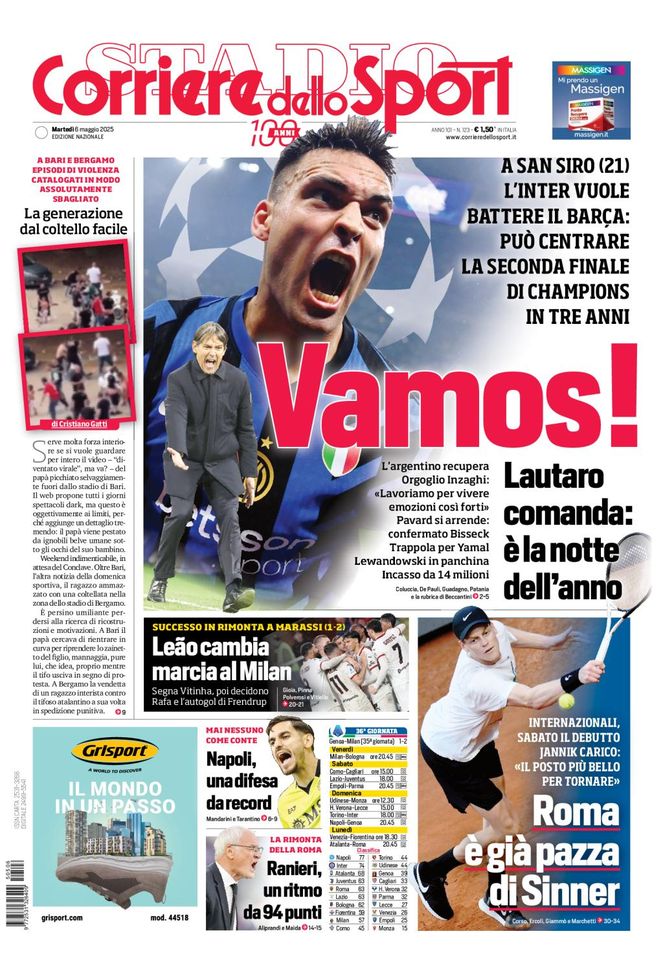 Il 'Corriere dello Sport' si apre con l'Inter, chiamato questa sera al successo contro il Barcellona a San Siro in semifinale di Champions League per conquistare l'accesso all'ultimo atto dopo il 3-3 dell'andata. Nella parte bassa spazio anche al Milan, che ha vinto in rimonta contro il Genoa grazie alle giocate di Rafael Leao. Infine si parla anche di Jannik Sinner, tornato ad allenarsi dopo il patteggiamento di tre mesi, dal Napoli e della sua difesa da record e della media punti della Roma di Claudio Ranieri.