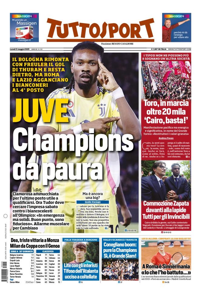 Questa è la prima pagina di 'Tuttosport', in edicola oggi, lunedì 5 maggio 2025. Diamo un’occhiata alle principali novità sul mondo dello sport e in particolare del calcio, cercando di evidenziare le notizie sul Milan.