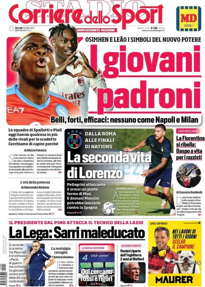 Il 'Corriere dello Sport' oggi in edicola, in prima pagina, apre con i 'giovani padroni' del campionato di Serie A 2021-2022, ovvero Victor Osimhen (Napoli) e Rafael Leão (Milan), simboli offensivi delle due squadre che più hanno convinto in questo avvio di stagione. Quindi, si parla di Lorenzo Pellegrini che, dopo il rinnovo con la Roma fino al 2026, potrebbe diventare punto fisso anche della Nazionale Italiana: il C.T. Roberto Mancini medita di lanciarlo titolare domani sera a 'San Siro' contro la Spagna. Mentre la Fiorentina punta sul Daspo a vita dagli stadi per i razzisti, la Lega Calcio se la prende con Maurizio Sarri, tecnico della Lazio, dandogli del maleducato per le dichiarazioni della scorsa domenica.