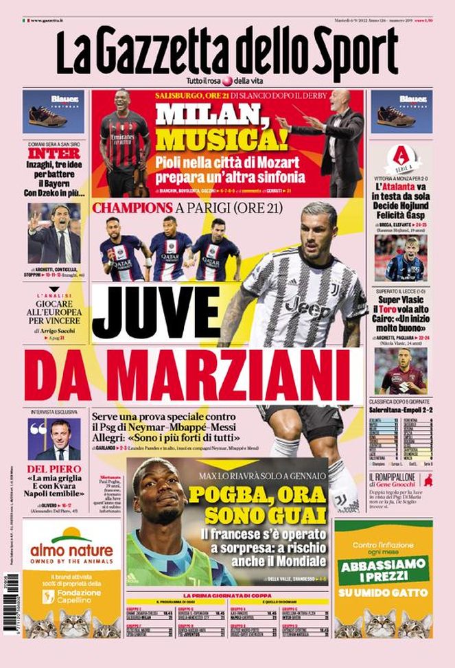 'La Gazzetta dello Sport' oggi in edicola, in prima pagina, apre parlando della Juventus di Massimiliano Allegri che, questa sera, alle ore 21:00, sarà ospite del PSG per la gara d'esordio nel Girone H della Champions League 2022-2023. Una Juve che, per tutta la prima parte di stagione, non avrà Paul Pogba. Il francese si è operato ieri al menisco, in dubbio anche la sua partecipazione ai Mondiali. In alto, sotto la testata, si parla invece del debutto del Milan nel Girone E della Champions: avverrà in casa del Salisburgo. Spazio, poi, alle ultime partite della 5^giornata di Serie A, con la vittoria dell'Atalanta sul campo del Monza (nerazzurri primi da soli in classifica) e dell'acuto del Torino contro il Lecce, a segno il solito Nikola Vlašić. Chiosa con la presentazione di Inter-Bayern Monaco di Champions di domani e l'intervista esclusiva con Alessandro Del Piero, che vede il Napoli di Kvicha Kvaratshkelia ben messo per la vittoria del campionato.