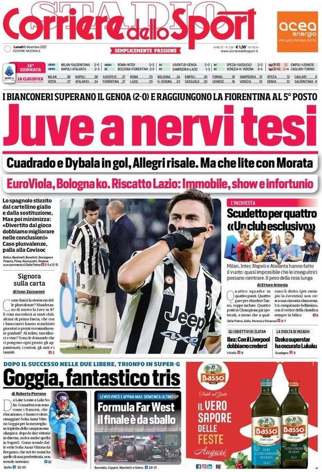 Il 'Corriere dello Sport' oggi in edicola, in prima pagina, apre con il successo della Juventus (2-0) in casa contro il Genoa. In gol vanno Juan Cuadrado e Paulo Dybala: i bianconeri di Massimiliano Allegri risalgono la classifica ed ora sono al quinto posto, a a quota 27 punti, insieme alla Fiorentina. Viola che vincono 3-2 a Bologna dando prova, finalmente, di essere un'ottima squadra anche lontano dalle mura amiche del 'Franchi'. Bene anche la Lazio, 3-1 sul campo della Sampdoria, con lo show (e l'infortunio) di Ciro Immobile. Infine, inchiesta sullo Scudetto: lotta a quattro tra Milan, Inter (domani impegnate in Champions League contro Liverpool e Real Madrid), Napoli ed Atalanta.