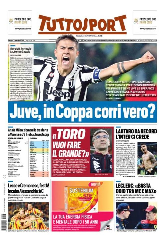Infine, 'Tuttosport' oggi in edicola, in prima pagina, apre con una critica molto dura alla Juventus di Massimiliano Allegri. I bianconeri, infatti, perdono 2-1 sul campo del Genoa, facendosi sfuggire di mano una vittoria che sembrava in ghiaccio per gran parte del match. Avanti con un bel destro a giro di Paulo Dybala, la Juve si fa raggiungere all'87' da Albert Guðmundsson e superare al 96' grazie al calcio di rigore trasformato dall'ex Domenico Criscito. Ieri sera, a 'San Siro', l'Inter sbanda contro l'Empoli, va sotto 0-2, poi rimonta con uno scatenato Lautaro Martínez e vince 4-2 prendendosi, momentaneamente, la vetta della classifica in attesa di Verona-Milan di domani sera. A proposito, in casa rossonera c'è un po' di ansia per la cessione ad InvestCorp che rischia di non concretizzarsi. Spazio, poi, a Torino-Napoli di questo pomeriggio, ore 15:00, con la squadra di Ivan Jurić chiamata a disputare un grande incontro ed ai verdetti del campionato di Serie B. Il Lecce e la Cremonese promossi in Serie A, l'Alessandria retrocessa in Serie C.