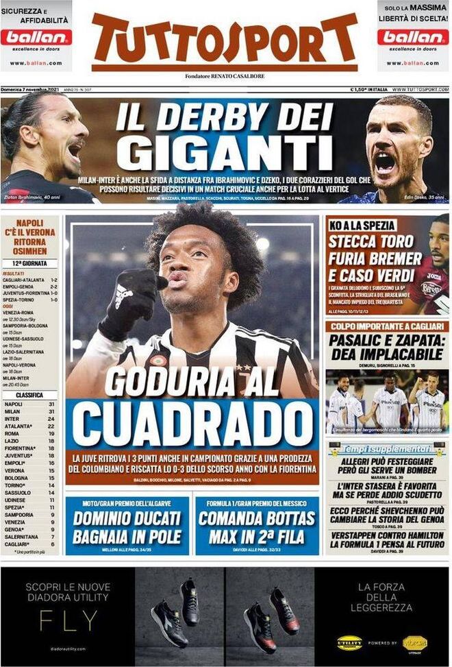 'Tuttosport' oggi in edicola, in prima pagina, apre parlando della vittoria interna della Juventus sulla Fiorentina. Successo ancora una volta di 'corto muso', 1-0, firmato da Juan Cuadrado nel recupero. In alto, invece, sotto la testata, viene presentato il derby di Milano, la sfida tanto attesa tra il Milan di Zlatan Ibrahimović e l'Inter di Edin Džeko. Un confronto che vale l'altissima classifica. Caduto, ieri, il Torino di Ivan Jurić a La Spezia: tra la furia del difensore brasiliano Bremer ed il caso del trequartista Simone Verdi. Vittoria, 1-2, a Cagliari per l'Atalanta di Gian Piero Gasperini grazie alle reti di Mario Pašalić e Duván Zapata.
