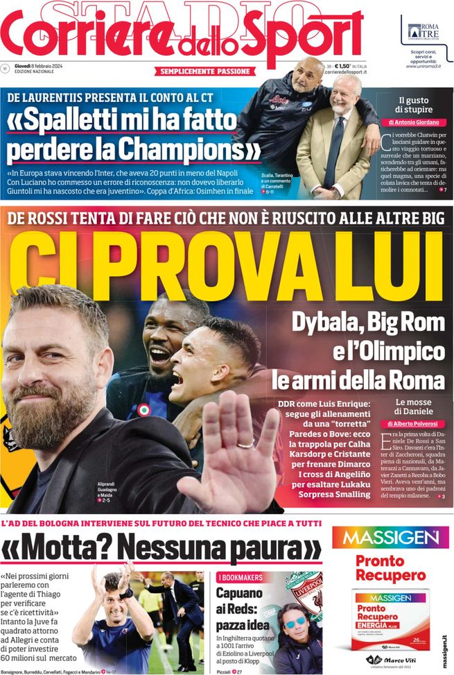 Il 'Corriere dello Sport' oggi in edicola, in prima pagina, apre parlando del tentativo della Roma di Daniele De Rossi di fermare la lanciata Inter di Simone Inzaghi nel prossimo big match di Serie A. I giallorossi punta sulla coppia d'attacco formata da Paulo Dybala e dall'ex Romelu Lukaku, oltre che sulla spinta dello stadio 'Olimpico', per fermare la corazzata nerazzurra.