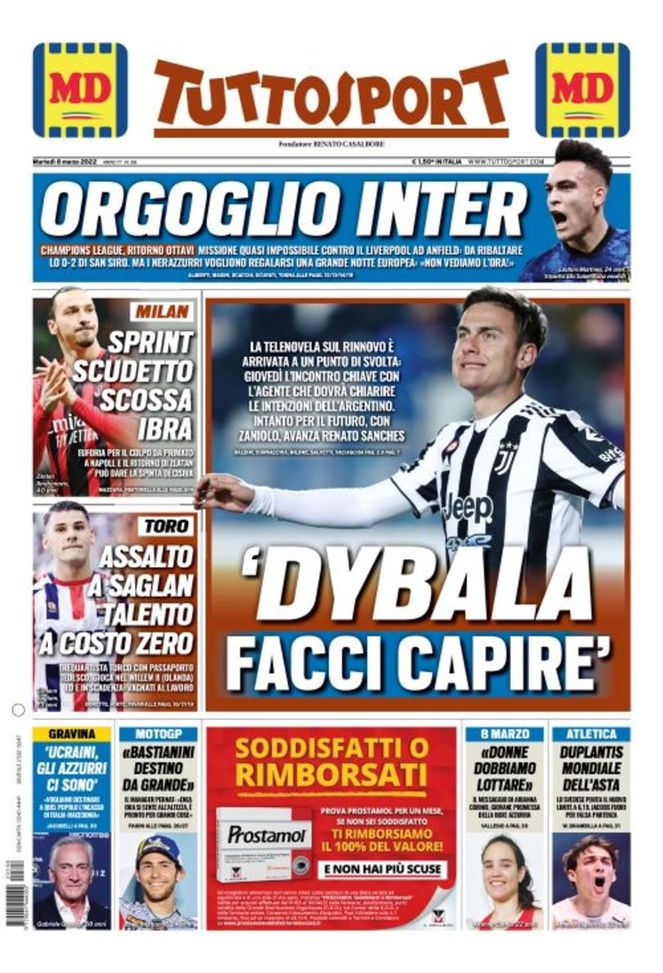 Infine, 'Tuttosport' oggi in edicola, in prima pagina, apre parlando del rinnovo di Paulo Dybala con la Juventus. Giovedì incontro chiave tra la società bianconera ed il suo entourage per capire se ci sarà la possibilità di andare avanti insieme o no. Per il calciomercato estivo, la Juve sogna Nicolò Zaniolo (Roma) e mette seriamente nel mirino Renato Sanches (Lille), centrocampista portoghese su cui c'è anche il Milan. I rossoneri di Stefano Pioli, dopo la vittoria di Napoli, puntano seriamente allo Scudetto: il ritorno di Zlatan Ibrahimović potrebbe contribuire ad alimentare le volontà di successo del Diavolo in Serie A. In alto, sotto la testata, si parla dell'Inter di Simone Inzaghi, che stasera, ore 21:00, sarà impegnata ad 'Anfield' contro il Liverpool nel ritorno degli ottavi di finale di Champions League. Si parte dal 2-0 per i 'Reds' dell'andata: ai nerazzurri servirà un'impresa. Chiosa con il mercato del Torino: i granata puntano Görkem Sağlam, centrocampista in scadenza di contratto con il Willem II.