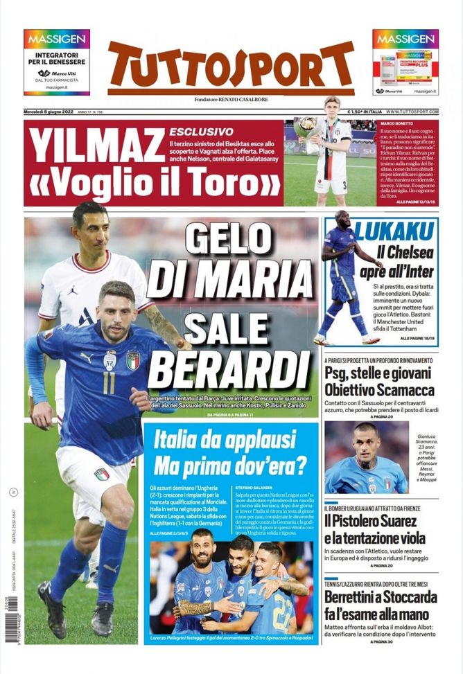 Infine 'Tuttosport' oggi in edicola, in prima pagina, apre con le ultime notizie di calciomercato sulla Juventus. Gelo nella trattativa con Ángel Di María, che è tentato dal Barcellona. La 'Vecchia Signora', irritata, ora potrebbe dunque puntare su Domenico Berardi del Sassuolo, le cui quotazioni sono in forte ascesa. Rıdvan Yılmaz, terzino turco del Beşiktaş, ha fatto invece presente di voler vestire la maglia del Torino nella prossima stagione. Il Chelsea apre all'Inter per il prestito di Romelu Lukaku, ora si tratta sulle condizioni. Insidia, però, dell'Atlético Madrid per Paulo Dybala: i nerazzurri vorrebbero stingere i tempi per la 'Joya'. La Fiorentina sogna di prendere Luís Suárez, disposto anche a ridursi l'ingaggio pur di restare a giocare in Europa, mentre il PSG punta Gianluca Scamacca, centravanti del Sassuolo e della Nazionale Italiana. A proposito degli Azzurri: vittoria 2-1 sull'Ungheria in Nations League con un gran gioco espresso in campo. Perché non averlo fatto vedere prima?