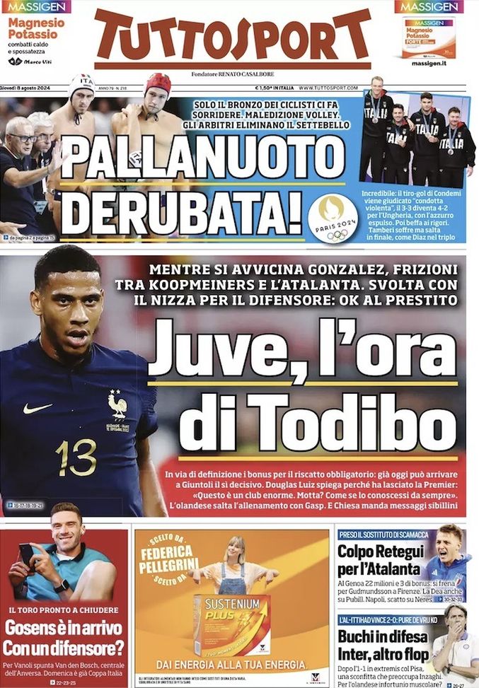 Infine, 'Tuttosport' oggi in edicola, in prima pagina, parla dell'operazione di calciomercato in corso tra Nizza e Juventus per il trasferimento del difensore centrale francese Jean-Clair Todibo, classe 1999, alla corte di Thiago Motta. In via di definizione l'affare: prestito oneroso con obbligo di riscatto. Si limano i dettagli sui bonus, già in giornata può arrivare il sì decisivo.