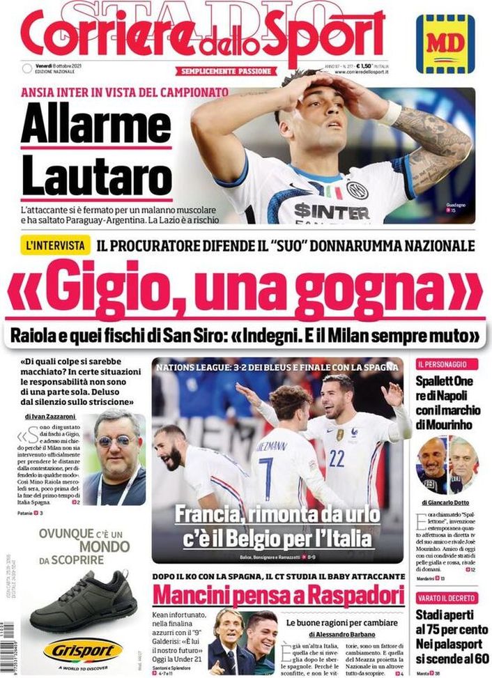 Il 'Corriere dello Sport' oggi in edicola, in prima pagina, apre con l'intervista esclusiva a Mino Raiola, agente di Gianluigi Donnarumma, intervenuto in sua difesa dopo i fischi ricevuti dal portiere durante Italia-Spagna 1-2 di Nations League a 'San Siro'. Attacco del procuratore al Milan, 'reo', a suo dire, di non aver sostenuto il ragazzo. In alto, sotto la testata, si parla dell'infortunio muscolare occorso, durante un allenamento con l'Argentina, a Lautaro Martínez, attaccante dell'Inter. Quanto dovrà stare fermo il 'Toro'? Spazio, poi, alle Nazionali, con Roberto Mancini che pensa di lanciare titolare Giacomo Raspadori in Italia-Belgio, finale per il 3° e 4° posto di Nations League di domenica a Torino e con la Francia che invece si gode Theo Hernández, autore del gol-vittoria ieri sera contro i Diavoli Rossi. Infine, celebrazione del nuovo 're di Napoli', Luciano Spalletti.