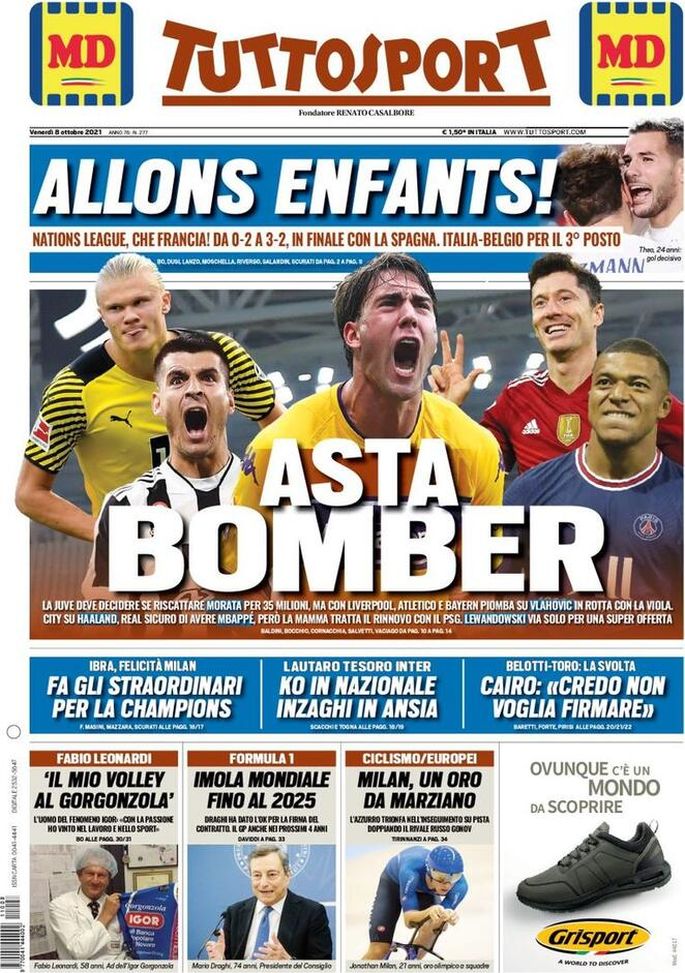 'Tuttosport' oggi in edicola, in prima pagina, apre parlando di calciomercato, italiano e internazionale, ponendo l'accento su tutti quei grandi centravanti che, al termine di questa stagione, potrebbero cambiare maglia. La Juventus, tra questi, è interessata a Dušan Vlahović, che lascerà la Fiorentina. Su di lui, però, anche Liverpool, Atlético Madrid e Bayern Monaco. In alto, sotto la testata, si parla di Belgio-Francia 2-3 di Nations League. I 'Bleus' di Didier Deschamps approdano in finale grazie ad un gol di Theo Hernández al 90'. Il Milan, inoltre, va in estasi anche perché, nel frattempo, Zlatan Ibrahimović brucia le tappe per tornare in campo sabato 16 ottobre contro il Verona a 'San Siro'. In casa Inter, guai per l'infortunio di Lautaro Martínez. Al Torino, infine, problema Andrea Belotti: secondo il Presidente Urbano Cairo il 'Gallo' non vuole rinnovare il suo contratto.