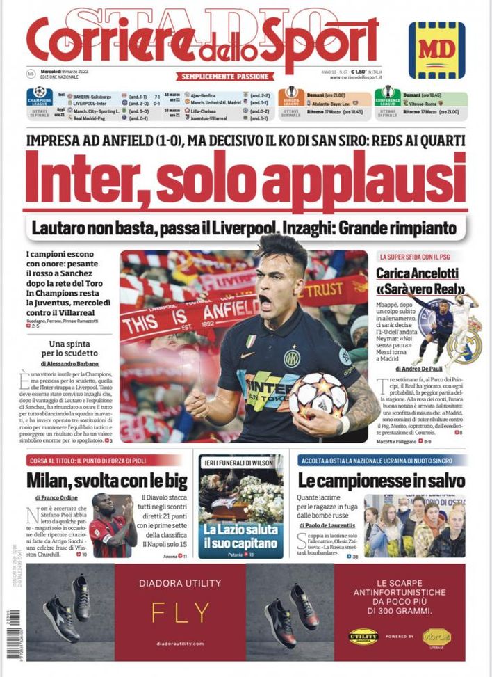 Il 'Corriere dello Sport' oggi in edicola, in prima pagina, apre facendo i complimenti all'Inter per la vittoria, 1-0, in casa del Liverpool, in occasione della partita di ritorno degli ottavi di finale di Champions League. I nerazzurri si impongono grazie ad un eurogol di Lautaro Martínez nella ripresa, ma non basta. Ai quarti vanno gli inglesi di Jürgen Klopp, che ne avevano fatti due all'andata a 'San Siro'. Stasera, allo stadio 'Santiago Bernabéu', il Real Madrid di Carlo Ancelotti cercherà il passaggio del turno contro il PSG di Mauricio Pochettino: si parte dall'1-0 dell'andata per i francesi firmato da Kylian Mbappé, che i 'rumors' di calciomercato danno già per calciatore dei 'Blancos' nella stagione 2022-2023. Infine, si parla dei temi della nostra Serie A. Nella corsa allo Scudetto, infatti, che vede coinvolte quattro squadre, ovvero Milan, Inter, Napoli e Juventus, i rossoneri di Stefano Pioli hanno un'arma in più: sono quasi infallibili negli scontri diretti.