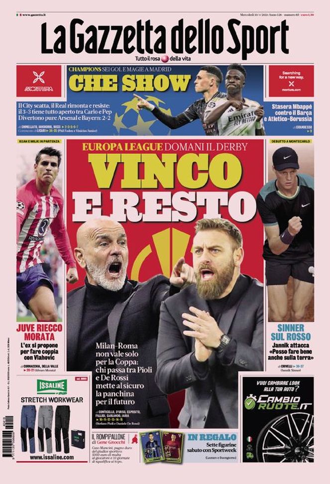 'La Gazzetta dello Sport' oggi in edicola, in prima pagina, apre parlando di Milan-Roma, partita di andata dei quarti di finale dell'Europa League 2023-2024 in programma domani sera alle ore 21:00 a 'San Siro'. Un doppio confronto che non vale soltanto per la coppa. Chi passa, infatti, tra Stefano Pioli e Daniele De Rossi, mette al sicuro la panchina per l'anno venturo.