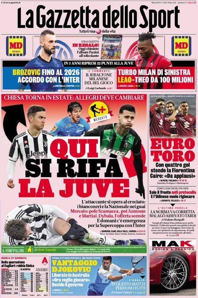 'La Gazzetta dello Sport' oggi in edicola, in prima pagina, apre con le mosse di calciomercato della Juventus. I bianconeri devono sostituire Federico Chiesa, che ha terminato la stagione per la lesione del legamento crociato anteriore del ginocchio sinistro. Si pensa a Gianluca Scamacca (Sassuolo), poi, a seguire, a Sardar Azmoun (Zenit) e Anthony Martial (Manchester United). Scende, nel frattempo, l'offerta a Paulo Dybala per il rinnovo del suo contratto. Domani sera i bianconeri giocheranno a 'San Siro' contro l'Inter per la finale di Supercoppa Italiana: i nerazzurri stanno per annunciare il rinnovo di Marcelo Brozović fino al 30 giugno 2026. In casa Milan, invece, ci si gode lo straordinario momento di forma di Theo Hernández e Rafael Leão, il cui valore complessivo, oggi, è di almeno 100 milioni di euro. Il Torino, nel 'Monday Night' della 21^ giornata di Serie A, ha demolito la Fiorentina con un roboante 4-0.