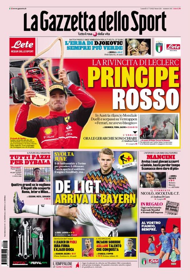 'La Gazzetta dello Sport' oggi in edicola, in prima pagina, apre parlando di tennis e Formula Uno. Sul calcio, invece, ampio spazio dedicato alla trattativa di calciomercato tra Juventus e Bayern Monaco per la cessione di Matthijs de Ligt ai tedeschi. Oggi arriva a Torino il direttore sportivo del Bayern, Hasan Salihamidžić, per trattare con i bianconeri. Il sogno della 'Vecchia Signora' per sostituire l'olandese è Kalidou Koulibaly, ma è possibile che vada su altre piste. Intanto, sono tutti pazzi per Paulo Dybala, svincolato dopo sette stagioni proprio alla Juventus. Il Napoli è uscito allo scoperto, ma anche Roma, Inter e Milan seguono con attenzione l'evolversi della vicenda della 'Joya'. A proposito di Milan: sta recuperando bene dall'infortunio e dall'operazione Simon Kjær, mentre Zlatan Ibrahimović è vicino alla firma sul rinnovo del contratto. In casa nerazzurra, invece, Kristjan Asllani sta sorprendendo il tecnico Simone Inzaghi in questi primi giorni di ritiro. Intervista, poi, a Roberto Mancini, Commissario Tecnico della Nazionale Italiana, che sprona i suoi giovani: in particolare Nicolò Zaniolo e Gianluca Scamacca.