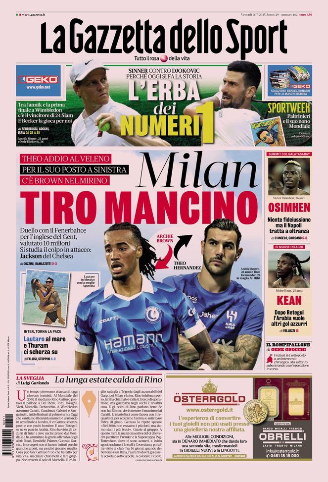 'La Gazzetta dello Sport' si apre con il calciomercato del Milan, tra l'addio di Theo Hernandez, con conseguente post su 'Instagram' in cui ha criticato in un certo senso l'attuale dirigenza, e il possibile arrivo di Archie Brown dal Genk. Spazio, però, anche a Jannik Sinner, che nella giornata odierna affronterà Novak Djokovic nella semifinale di Wimbledon 2025.