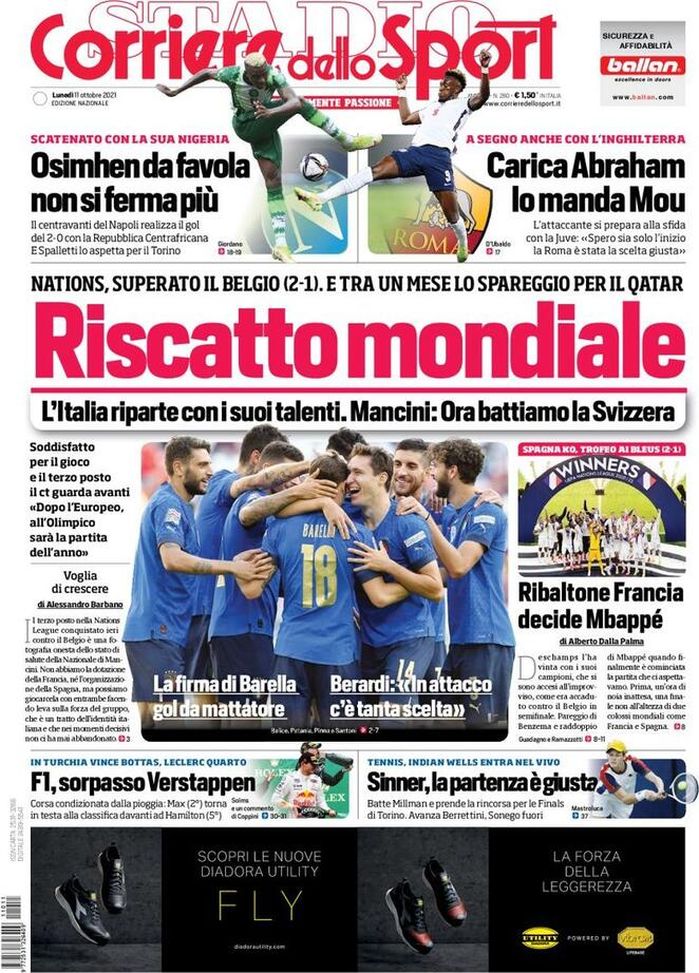 Il 'Corriere dello Sport' oggi in edicola, in prima pagina, apre con il riscatto degli 'Azzurri' di Roberto Mancini. La finale per il terzo e quarto posto in Nations League, quella tra Italia e Belgio, finisce infatti 2-1 per la nostra Nazionale, a segno con Nicolò Barella e Domenico Berardi. Battendo la Svizzera a novembre, l'Italia farebbe un grosso passo verso i Mondiali di Qatar 2022. La finale, invece, di Nations League ha visto vincere, sempre per 2-1, la Francia sulla Spagna: decisivi Karim Benzema e Kylian Mbappé, assist per il rossonero Theo Hernández sulla seconda rete. In alto, sotto la testata, si parla di due bomber del nostro campionato che fanno sfracelli anche con le rispettive selezioni nazionali: Victor Osimhen (Napoli, Nigeria) e Tammy Abraham (Roma, Inghilterra).