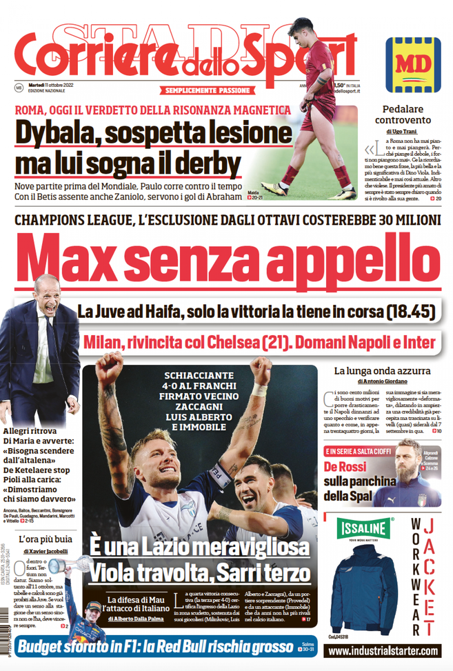 Il 'Corriere dello Sport' oggi in edicola, in prima pagina, apre parlando di Maccabi Haifa-Juventus, partita della 4^ giornata del Girone H della Champions League 2022-2023. Gara senza appello per i bianconeri di Massimiliano Allegri. Soltanto una vittoria, infatti, terrebbe la 'Vecchia Signora' in corsa per il passaggio del turno nel gruppo con PSG e Benfica. Un'eventuale esclusione costerebbe, alla società di Corso Galileo Ferraris, ben 30 milioni di euro. Stasera, alle ore 21:00, in campo anche il Milan, che ospiterà il Chelsea a 'San Siro' senza Charles De Ketelaere: risentimento muscolare per il fantasista belga. Domani, invece, il programma di Champions vedrà Barcellona-Inter e Napoli-Ajax. Si parla, poi, anche dei temi del campionato: in alto, sotto la testata, l'infortunio di Paulo Dybala. La 'Joya' rischia di indossare nuovamente la maglia giallorossa nel 2023: ad oggi, a rischio anche i Mondiali in Qatar del mese prossimo. Una Lazio bellissima, invece, passa con agilità e scioltezza (0-4) sul campo della Fiorentina nel posticipo della 9^ giornata: la squadra di Maurizio Sarri è terza. In Serie B, la Spal ufficializza il nuovo allenatore: è Daniele De Rossi.