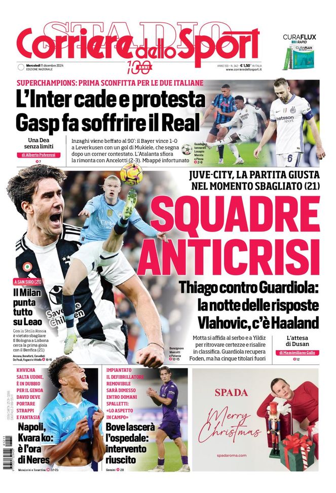 Il 'Corriere dello Sport' oggi in edicola, in prima pagina, apre presentando Juventus-Manchester City, partita della 6^ giornata della Fase Campionato della Champions League 2024-2025 in programma stasera, alle ore 21:00, all'Allianz Stadium di Torino. La gara giusta nel momento sbagliato, con due squadre in crisi. Thiago Motta contro Pep Guardiola, ma anche Dušan Vlahović contro Erling Braut Haaland: questa sarà la notte delle risposte.