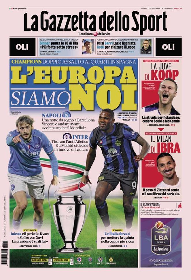 Gli azzurri, con un eventuale passaggio del turno, si garantirebbero la partecipazione al Mondiale per Club FIFA 2025; i nerazzurri - a Madrid - si giocano anche il rinnovo del contratto del loro capitano, Lautaro Martínez. In alto, sotto la testata, si parla della sconfitta interna (1-2) della Lazio di Maurizio Sarri contro l'Udinese e dei venti di crisi che spirano nella Capitale. Ma anche dell'esonero di Roberto D'Aversa e dell'arrivo di Luca Gotti sulla panchina del Lecce.