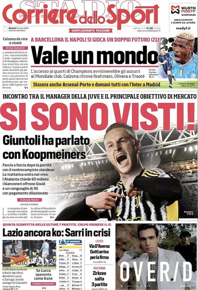 Il 'Corriere dello Sport' oggi in edicola apre, in prima pagina, con una rivelazione di calciomercato: l'incontro tra Cristiano Giuntoli, direttore dell'area tecnica della Juventus e Teun Koopmeiners, centrocampista dell'Atalanta, obiettivo della 'Vecchia Signora' per l'estate.