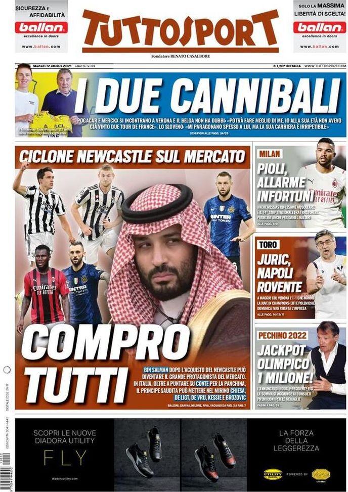'Tuttosport' oggi in edicola, in prima pagina, apre con parlando di calciomercato internazionale e, in particolare, del ciclone Newcastle pronto ad abbattersi sull'Europa. Il principe Bin Salman punta Antonio Conte per la panchina e, per il campo, ha messo nel mirino Federico Chiesa, Matthijs de Ligt, Stefan de Vrij, Franck Kessié e Marcelo Brozović. In casa Milan, intanto, è allarme infortuni: si ferma Junior Messias, è il 14° stop tra i rossoneri in questa stagione. Problemi anche per Daniel Maldini. Spazio, infine, a Napoli-Torino di domenica ed al ritorno di Ivan Jurić allo stadio 'Diego Armando Maradona': qualche mese fa, pareggiando lì alla guida dell'Hellas Verona, tolse la Champions League alla squadra partenopea.