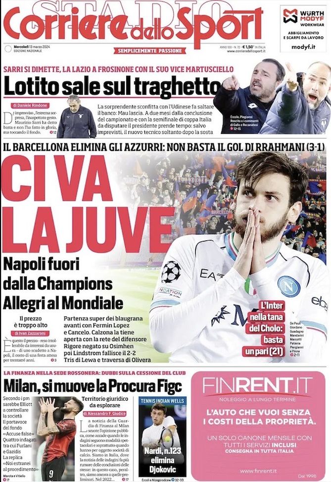 Il 'Corriere dello Sport' oggi in edicola, in prima pagina, apre con Barcellona-Napoli, partita di ritorno degli ottavi di finale della Champions League 2023-2024 disputatasi ieri sera e terminata 3-1 per i catalani. Gli azzurri, con questa sconfitta e dopo l'1-1 della gara di andata al 'Maradona', sono eliminati dal torneo. E fuori anche dal Mondiale per Club FIFA 2025 in favore della Juventus.
