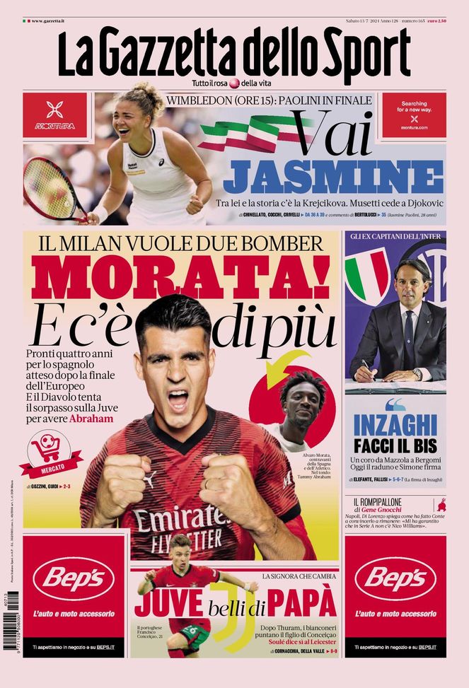 'La Gazzetta dello Sport' oggi in edicola, in prima pagina, apre parlando dei movimenti di calciomercato del Milan. Il club rossonero, infatti, vuole due attaccanti. Uno sarà lo spagnolo Álvaro Morata: domani giocherà la finale degli Europei con la Spagna, quindi visite mediche e firma su un contratto quadriennale con il Diavolo.