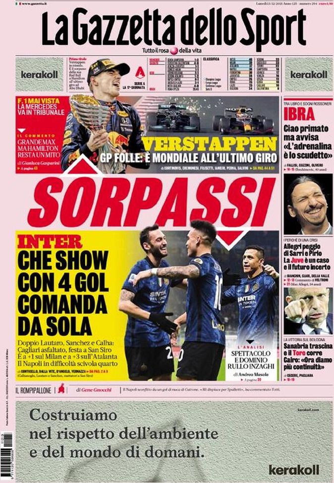 'La Gazzetta dello Sport' oggi in edicola, in prima pagina, apre con il sorpasso dell'Inter di Simone Inzaghi in vetta alla classifica di Serie A. A 'San Siro' i nerazzurri schiantano 4-0 il Cagliari (doppio Lautaro Martínez, Alexis Sánchez e Hakan Çalhanoğlu) e vanno a +1 sul Milan, che ieri era stato fermato ad Udine. Ma si parla anche del sorpasso di Max Verstappen ai danni di Lewis Hamilton nel Mondiale di Formula Uno, con conseguente vittoria finale dell'olandese. Spazio, dunque, a Zlatan Ibrahimović, che ieri alla Triennale di Milano ha presentato il suo libro, 'Adrenalina', ai problemi della Juventus di Massimiliano Allegri ed alla vittoria del Torino sul Bologna. Il Presidente Urbano Cairo, ora, chiede continuità.