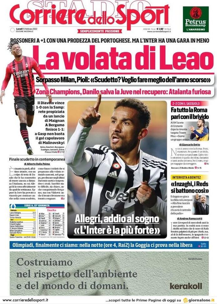 Il 'Corriere dello Sport' oggi in edicola, in prima pagina, apre con la volata di Rafael Leão: il gol del portoghese in Milan-Sampdoria, arrivato con una cavalcata sulla fascia sinistra dopo l'assist del portiere Mike Maignan, basta, infatti, ai rossoneri di Stefano Pioli per issarsi in vetta alla classifica di Serie A davanti all'Inter (che ha però una partita in meno). Il Diavolo prosegue nel suo percorso: l'obiettivo è fare più punti dei 79 della precedente stagione. Si vedrà, poi, se ciò porterà anche la vittoria dello Scudetto. Un gol di Danilo in pieno recupero, invece, salva la Juventus in casa dell'Atalanta, che si era portata avanti con Ruslan Malinovskyi. Ma Massimiliano Allegri, tecnico bianconero, spegne le velleità di vittoria del titolo della sua squadra: per 'Acciughina', il campionato lo vincerà l'Inter. Intervista esclusiva a Rafa Benítez, ex tecnico proprio dei nerazzurri e del Liverpool, l'avversario di mercoledì sera in Champions League a 'San Siro'. Chiusura con il 2-2 di Sassuolo-Roma.