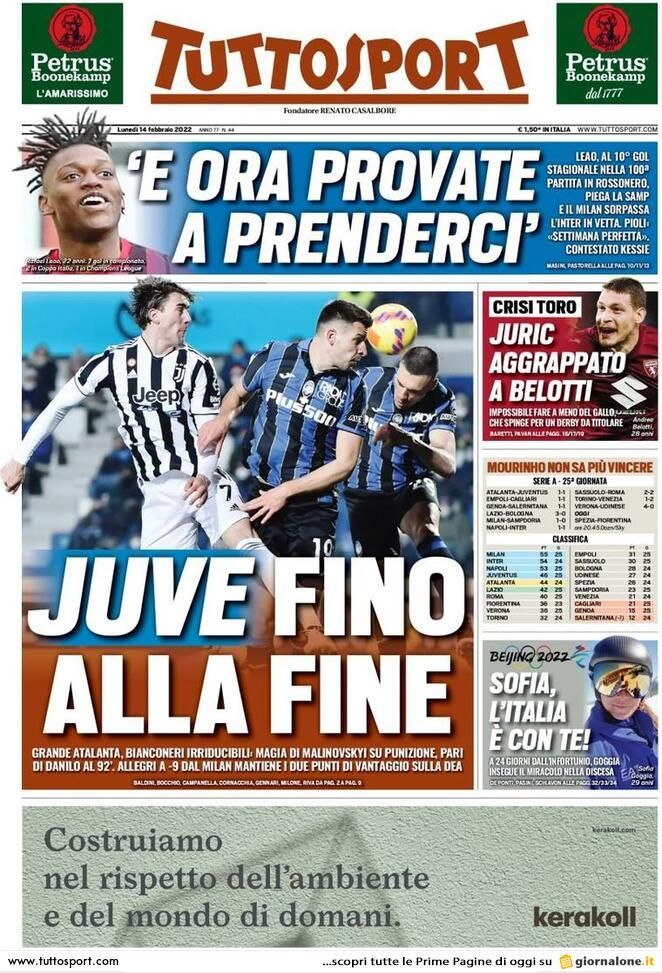 Infine 'Tuttosport' oggi in edicola, in prima pagina, apre parlando di Juventus. I bianconeri, infatti, escono indenni da Atalanta-Juventus del 'Gewiss Stadium': al gol di Ruslan Malinovskyi risponde, in pieno recupero, il brasiliano Danilo. La 'Vecchia Signora' è a -9 dal Milan capolista e resta davanti alla 'Dea' nella corsa ad un posto in Champions League. In alto, sotto la testata, si parla proprio del Diavolo, che batte 1-0 la Sampdoria a 'San Siro' e scavalca l'Inter in testa alla classifica. Decide un gol di Rafael Leão in apertura. Fischi, però, dei tifosi rossoneri a Franck Kessié che non rinnova il suo contratto con il Milan. Il Torino di Ivan Jurić, in crisi e sconfitto in casa sabato 1-2 dal Venezia, si aggrappa, ora, al ritorno del 'Gallo', Andrea Belotti, per rilanciarsi in campionato.