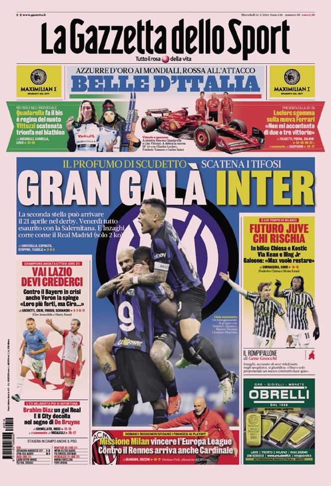 'La Gazzetta dello Sport' oggi in edicola, in prima pagina, apre parlando dell'Inter di Simone Inzaghi che, andando avanti di questo passo, potrebbe vincere aritmeticamente il campionato e il 20° Scudetto della sua storia, quello della seconda stella, nel derby del prossimo 21 aprile.