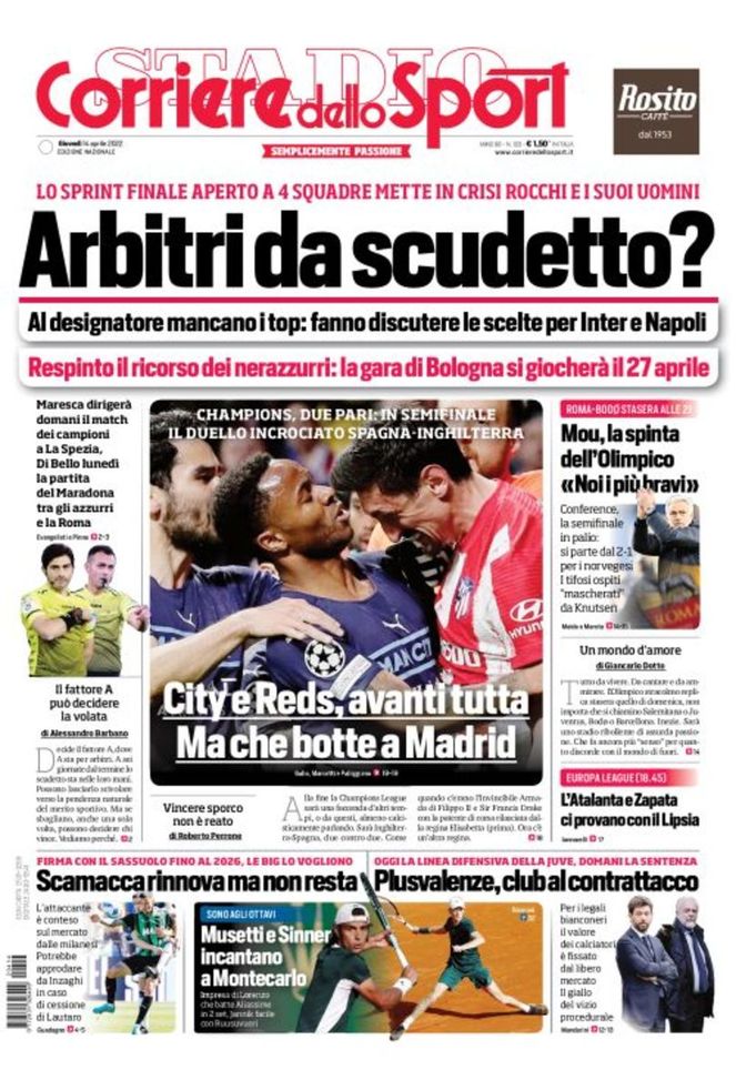 Il 'Corriere dello Sport' oggi in edicola, in prima pagina, apre con un interrogativo: ci sono arbitri a sufficienza per dirigere le partite della lotta Scudetto in Serie A? Il fatto che siano rimaste in quattro (Milan, Inter, Napoli e Juventus) a contendersi il titolo, infatti, mette un po' in difficoltà il designatore Gianluca Rocchi, che non ha arbitri top per tutte le partite necessarie. Fanno discutere, infatti, le designazioni per Spezia-Inter e Napoli-Roma. Intanto, respinto dal CONI il ricorso dei nerazzurri, che dovranno quindi disputare il 27 aprile a Bologna il loro recupero di campionato. Mentre la Juventus passa al contrattacco nel processo plusvalenze (oggi la linea difensiva dei bianconeri, domani la sentenza) e Gianluca Scamacca rinnova con il Sassuolo fino al 30 giugno 2026, restando, però, sul mercato e nel mirino delle milanesi, si parla di coppe europee. In Champions League, passano Liverpool e Manchester City: fuori Benfica ed Atlético Madrid. Ma che botte nel finale della partita del 'Wanda Metropolitano'! José Mourinho carica la sua Roma, che ospita il Bodø/Glimt nel ritorno dei quarti di Conference League.