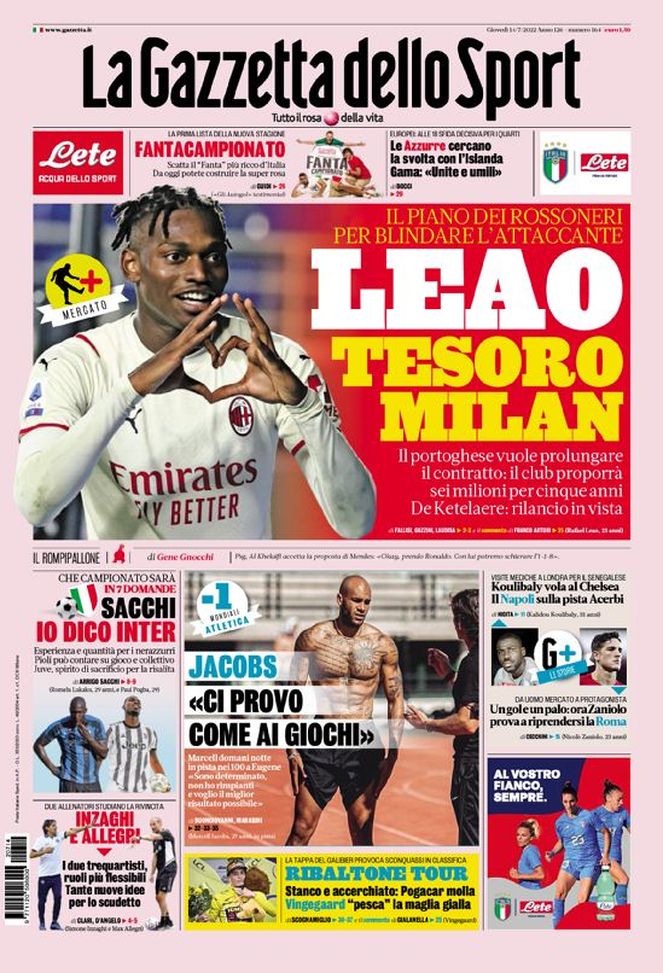 'La Gazzetta dello Sport' oggi in edicola, in prima pagina, apre parlando della trattativa per il rinnovo del contratto di Rafael Leão con il Milan. Pronta una proposta da 6 milioni di euro netti a stagione per i prossimi 5 anni. Per Charles De Ketelaere del Bruges, intanto, il Diavolo è atteso al rilancio. Arrigo Sacchi prova a fare le carte al campionato e dice che per lui Inter e Juventus sono davanti a tutte. I due allenatori, Simone Inzaghi per i nerazzurri e Massimiliano Allegri per i bianconeri, provano a cercare in allenamento nuove idee, chiavi e variabili per tornare a vincere lo Scudetto. Il Napoli ha salutato Kalidou Koulibaly, volato a Londra per le visite mediche con il Chelsea e pensa di sostituirlo con Francesco Acerbi. La Roma, invece, ha accolto il ritorno in campo di Nicolò Zaniolo nell'amichevole contro il Sunderland: un gol e un palo per lui.