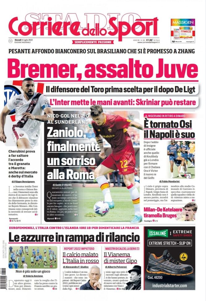 Il 'Corriere dello Sport' oggi in edicola, in prima pagina, parla dell'assalto della Juventus a Gleison Bremer, difensore centrale brasiliano del Torino. È lui la prima scelta bianconera per sostituire Matthijs de Ligt, in trattativa con il Bayern Monaco. Il classe 1997 si è promesso all'Inter, ma ora la 'Vecchia Signora' prova a far saltare l'affare. I nerazzurri si cautelano: adesso Milan Škriniar potrebbe persino restare. Gol di Nicolò Zaniolo nel 2-0 rifilato in amichevole dalla Roma al Sunderland, mentre il Napoli sorride per aver ritrovato finalmente in ritiro il bomber nigeriano Victor Osimhen. Tra Milan e Bruges, invece, è tira e molla per Charles De Ketelaere: riusciranno i rossoneri a portarlo alla corte di Stefano Pioli? Chiusura con gli Europei Femminili di calcio: l'Italia gioca oggi, alle ore 18:00, contro l'Islanda, per dimenticare l'1-5 incassato dalla Francia all'esordio.