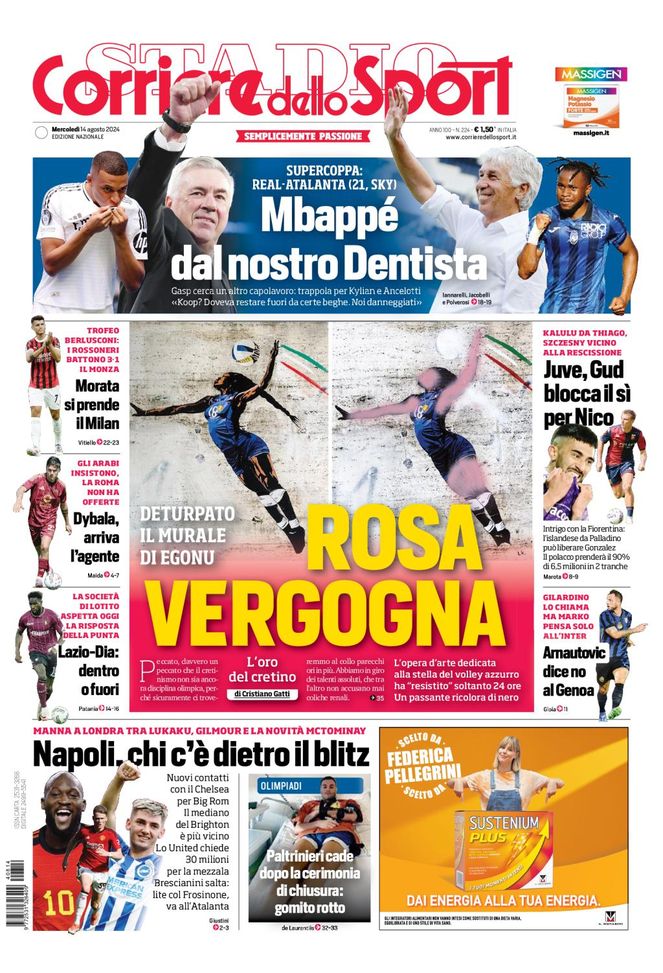 Il 'Corriere dello Sport' oggi in edicola, in prima pagina, sotto la testata, parla di Real Madrid-Atalanta, finale della Supercoppa Europea in programma stasera, alle ore 21:00, allo stadio nazionale di Varsavia (Polonia). La nuova stella dei 'Blancos' di Carlo Ancelotti, l'attaccante francese Kylian Mbappé, all'esame del 'dentista', ovvero degli scorbutici orobici di Gian Piero Gasperini.
