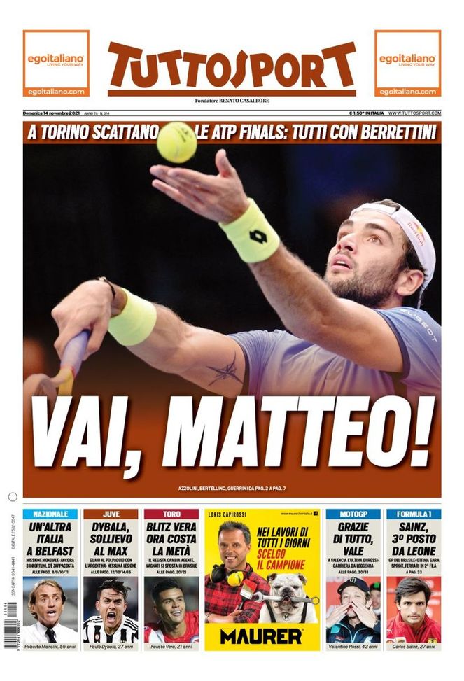 La prima pagina di 'Tuttosport', in edicola oggi, 14 novembre 2021