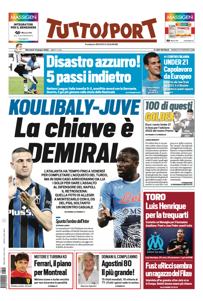 Infine 'Tuttosport' oggi in edicola, in prima pagina, apre con uno dei grandi obiettivi della Juventus per questo calciomercato estivo: Kalidou Koulibaly del Napoli. La chiave per portare a Torino il difensore centrale senegalese, classe 1991, in scadenza di contratto il 30 giugno 2023, può essere il cartellino di Merih Demiral. Il turco, infatti, non sarà riscattato dall'Atalanta e farà ritorno in bianconero, dove, però, non rientra nel progetto tecnico. Per il quotidiano torinese, poi, soltanto casuale l'incontro a Parigi tra Massimiliano Allegri, tecnico della Juve, e Luis Campos, consulente del PSG anche sul mercato. Il Torino punta il trequartista brasiliano Luis Henrique dell'Olympique Marsiglia, senza dimenticare João Pedro e il riscatto di Dennis Praet. In alto, sotto la testata, le due facce del calcio azzurro. Crolla, 2-5, in Germania l'Italia di Roberto Mancini in Nations League; vola, invece, agli Europei l'Under 21 di Paolo Nicolato dopo il 4-1 all'Irlanda.