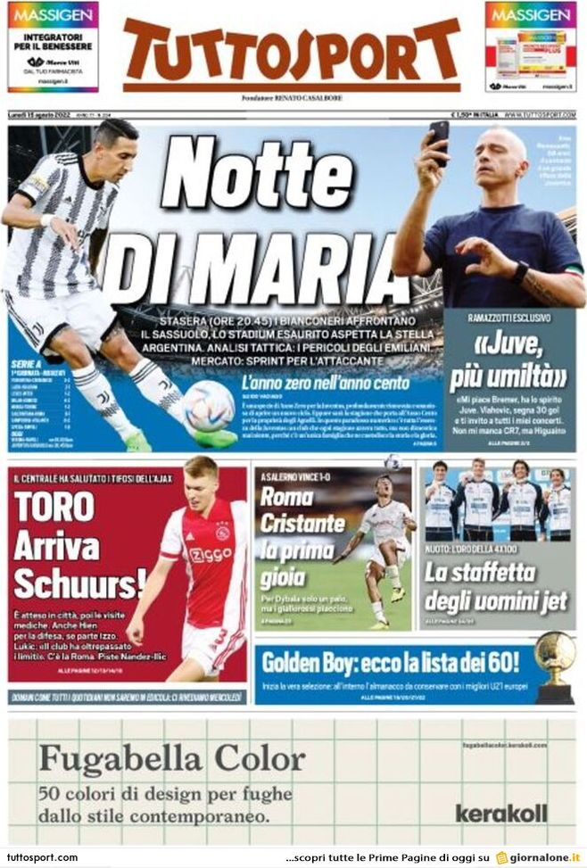 Infine 'Tuttosport' oggi in edicola, in prima pagina, apre parlando di Juventus-Sassuolo, gara delle ore 20:45 che chiuderà oggi il primo turno di Serie A. I bianconeri, nella fattispecie, si aspettano tanto dalla loro nuova stella, il 'Fideo' Ángel Di María. Intervista esclusiva ad Eros Ramazzotti, famoso cantautore italiano e tifoso juventino, che vorrebbe vedere più umiltà nella sua squadra. Il Torino si muove ancora sul mercato: preso Perr Schuurs, classe 1999, difensore centrale olandese dall'Ajax. Potrebbe, però, andare via il capitano Saša Lukić, che piace alla Roma. A proposito dei giallorossi: esordio con vittoria per la squadra di José Mourinho in questo campionato. Espugnato lo stadio 'Arechi', casa della Salernitana, con un gol di Bryan Cristante. Bella partita disputata da Paulo Dybala, fermato soltanto dal palo.